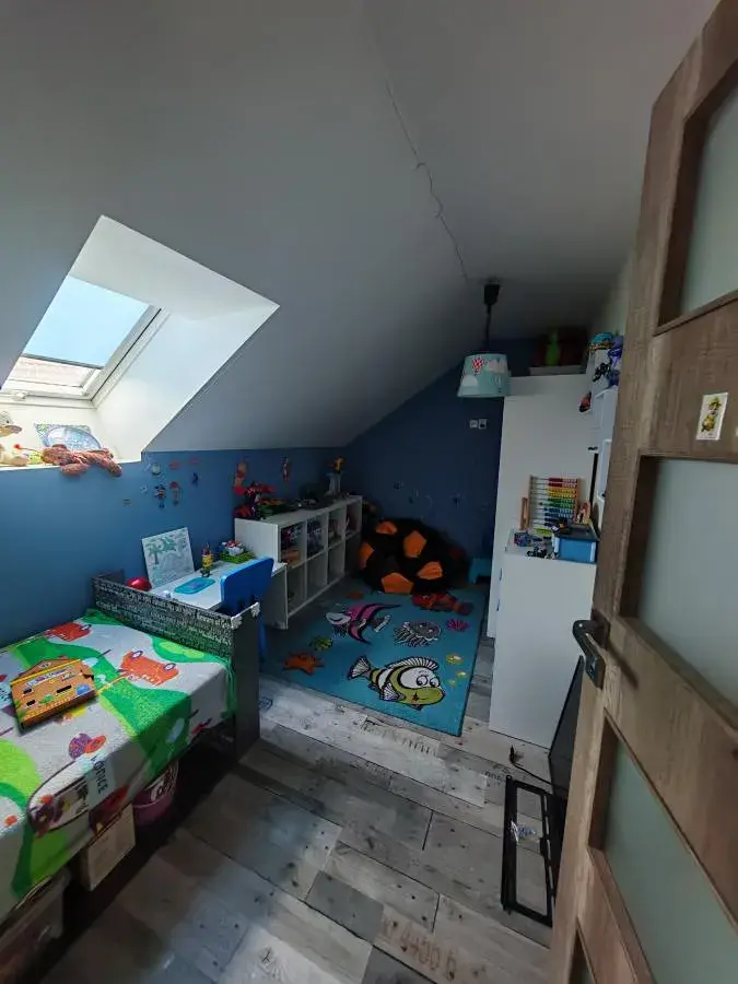 V podkroví se nachází tři dětské pokoje a ložnice se samostatnou šatní místností a koupelna s vybavením rohové vany.