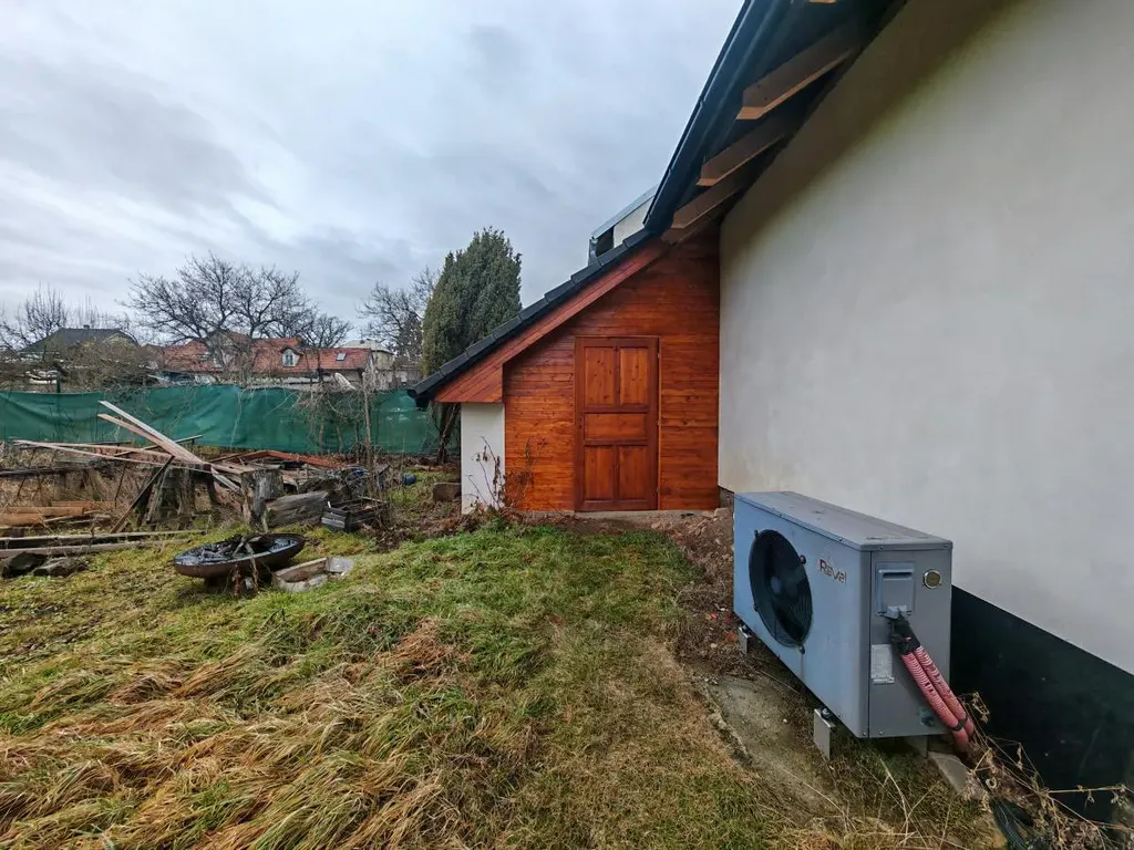 Přízemí domu tvoří prostorný obývací pokoj s krbem a kuchyní, kde je nainstalován posuvný HS portál s výstupem na zahradu, kde se nachází velká krytá dřevěná terasa o velikosti přibližně 45 m². Na terasu je zavedeno elektrické osvětlení a rozvod elektřiny, což zajišťuje její pohodlné venkovní užívání. V přízemí dále naleznete sociální zařízení se sprchou, pracovnu, jídelnu, komoru na potraviny a místnost s technologickým zařízením tepelného čerpadla a podlahového vytápění pro přízemí. Na podlahové vytápění v podkroví je umístěna samostatně v chodbě.