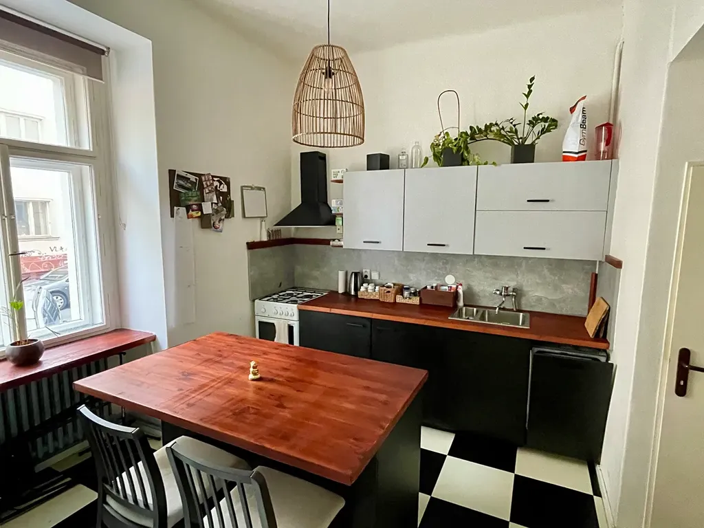 Nabízím k dlouhodobému pronájmu částečně zařízený byt s dispozicí 2+1 ve zvýšeném přízemí v klidné části Smíchova. Kuchyň je zařízena kuchyňskou linkou, plynovým sporákem s troubou, digestoří, myčkou, pračku a lednicí s mrazákem. V obývacím pokoji je pohovka, konferenční a televizní stolek. V ložnici pak manželská postel. Vedle ložnice se nachází prostorná šatna a byt obecně disponuje velkými úložnými prostorami.