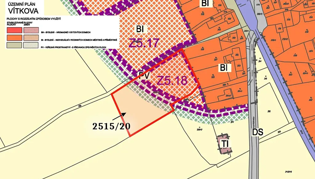 Pozemek je zapsán pod číslem 2515/20 na listu vlastnictví 3429 v KÚ Vítkov. Její výměra je 7 340 m2. Zhruba 3 125 m2 z toho leží v ploše pro výstavbu individuálního bydlení v rodinných domech. Navazuje pak pás plochy veřejného prostranství. Náhled územního plánu je ve fotogalerii inzerce.