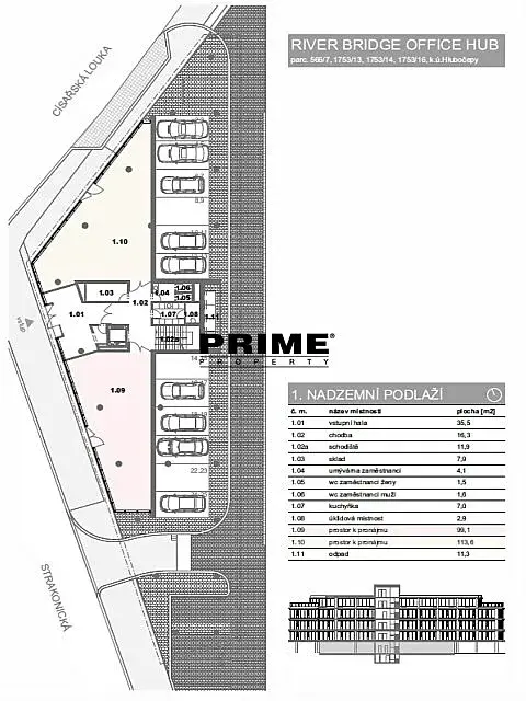 Nové obchodní prostory k pronájmu, 99,1m2, situované v přízemí v nově vznikající moderní administrativní budově River Bridge Office Hub. Objekt je součástí areálu River Business Centre a nachází se na rozhraní Smíchova a Hlubočep, na břehu Vltavy, u rozestavěného Dvoreckého mostu, přímo u rychlostní silnice R4, naproti zastávce tramvaje a stanici autobusu, nedaleko stanice metra a vlakového nádraží Smíchovské nádraží, 5 minut na dálnici D5 a 6 minut na dálnici D1.