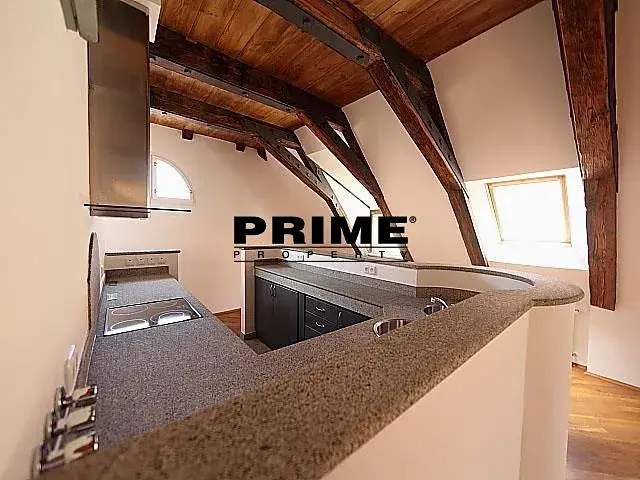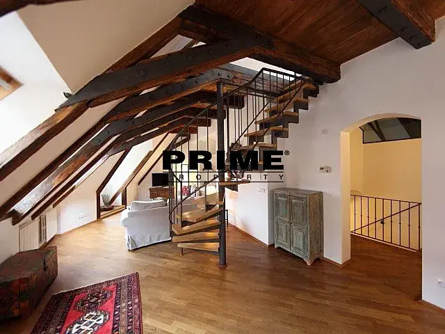 Nájemce neplatí provizi. Zrekonstruovaný, 3 ložnicový, zařízený, podkrovní atypický mezonetový byt se 2 koupelnami k pronájmu, 4+kk, 221m2, situovaný ve 3. a 4. patře kompletně zrenovovaného historického domu s výtahem a malebným zeleným nádvořím s fontánami.