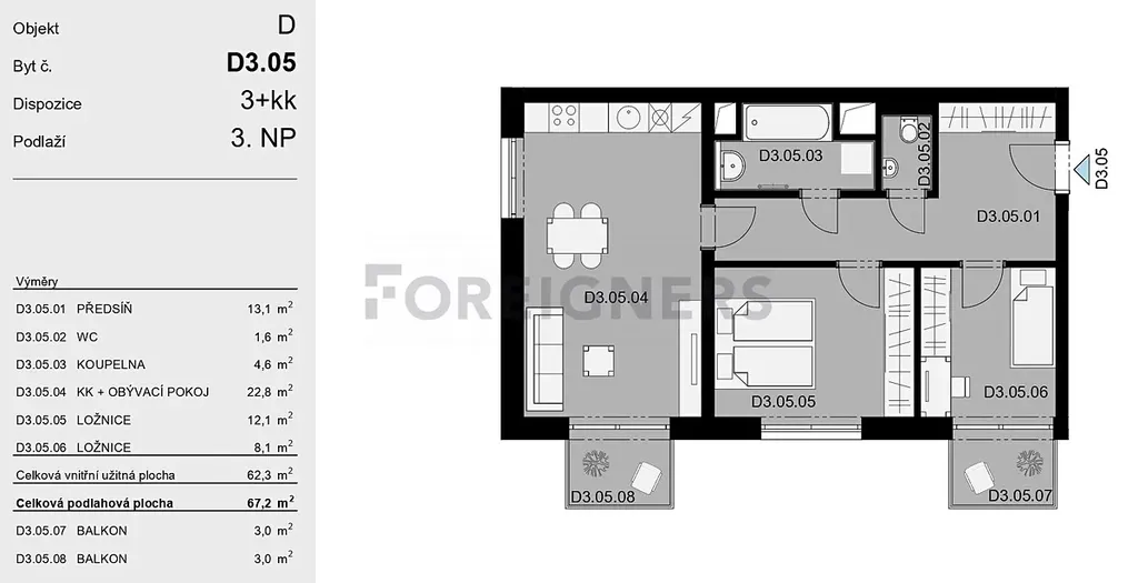 Byt je umístěn ve 3. nadzemním podlaží čtyřpodlažního domu a disponuje praktickým a promyšleným uspořádáním. Dominantou bytu je obývací pokoj s kuchyňským koutem a vstupem na balkon. Dále jsou zde dvě samostatné místnosti (ložnice a menší pokoj), z nichž jedna má vlastní balkon, koupelna s vanou, samostatné WC a prostorná předsíň.