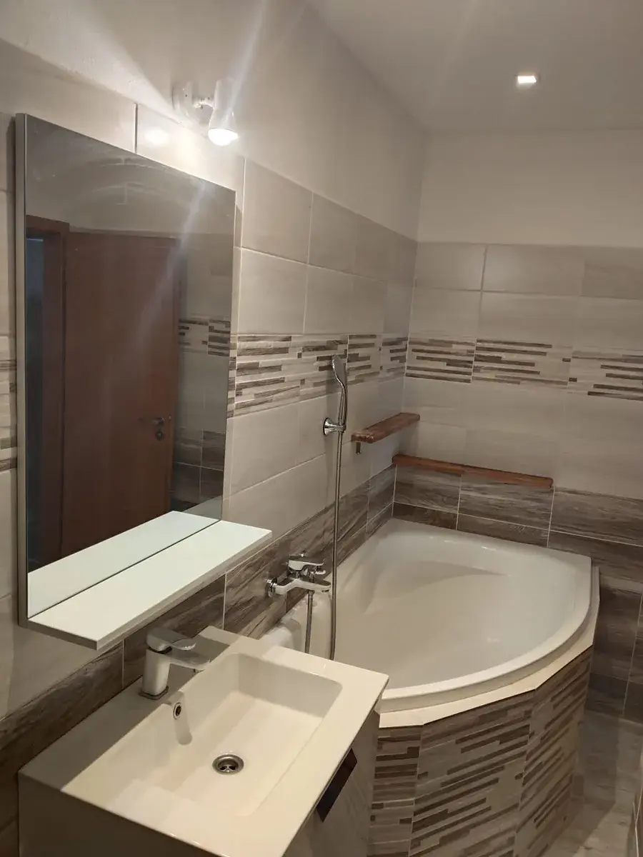 Velmi hezká je i koupelna, která disponuje rohovou vanou, prostorem pro pračku i sušičku a koupel. skříňkou. Toaleta je samostatná.