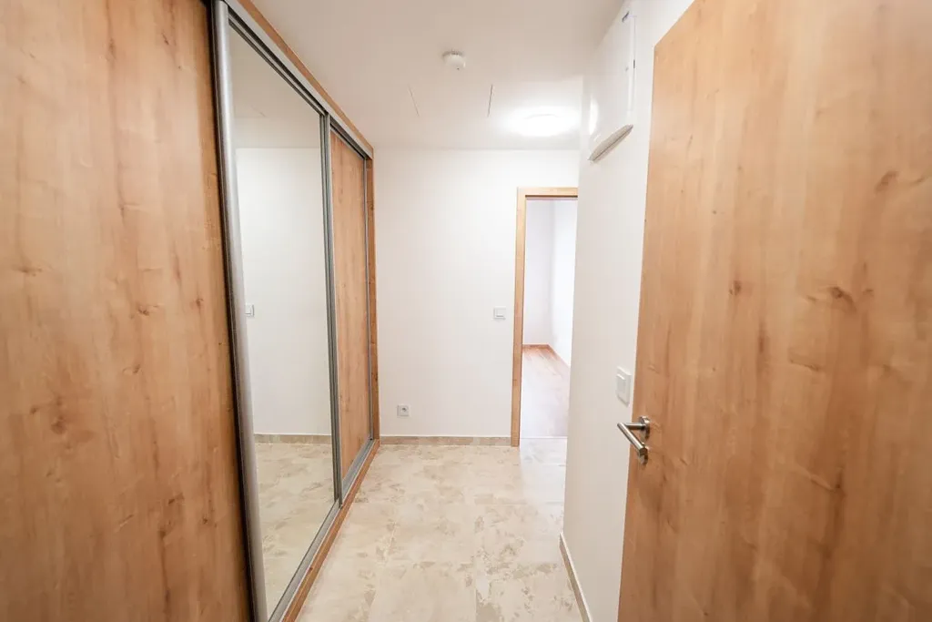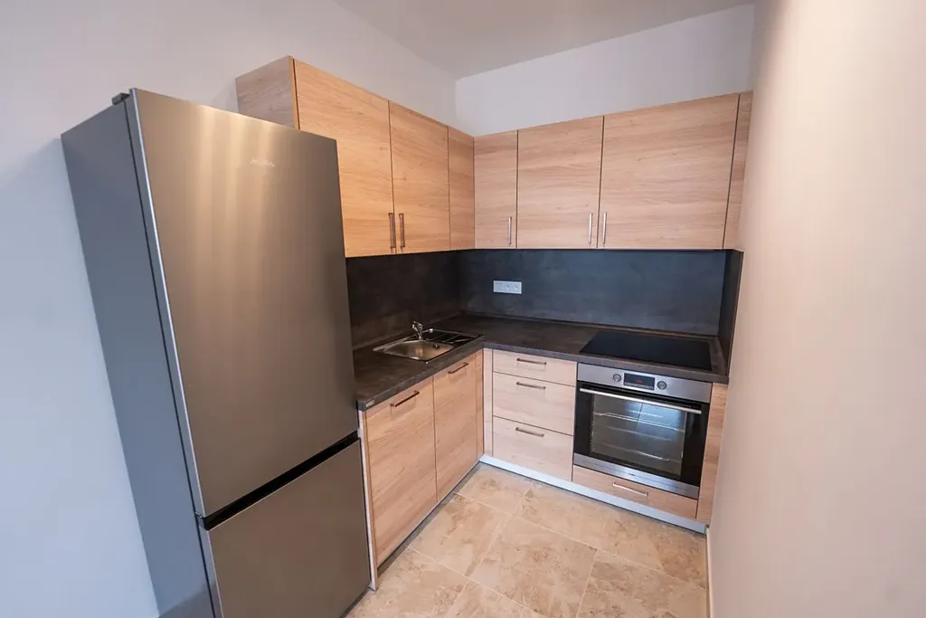 Dosud nebydlený byt je zařízený novou kuchyňskou linkou se elektrickou varnou deskou, troubou, lednicí a myčkou, v koupelně sprchový kout s WC. V předsíni vestavěná šatní skříň.