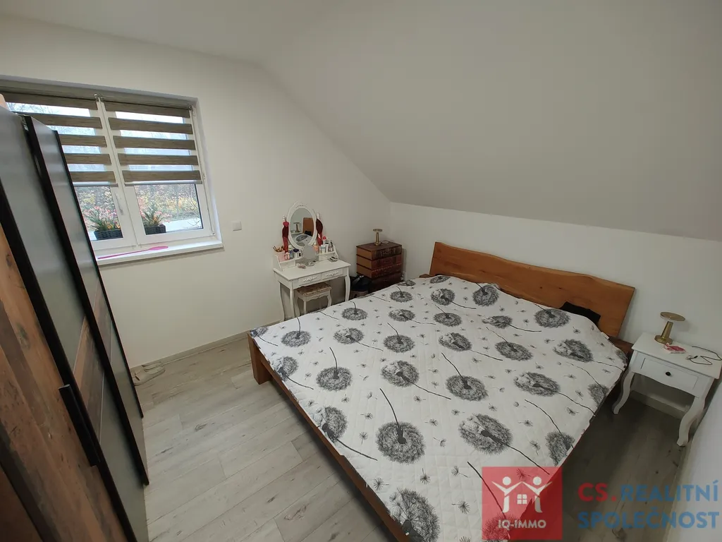 Samotný dům je novostavbou umístěnou v zahradě o velikosti cca 690 m2, v přízemí se nachází obývací pokoj s kuchyňským koutem, koupelna s wc. V horním patře jsou dva samostatné pokoje a další koupelna.