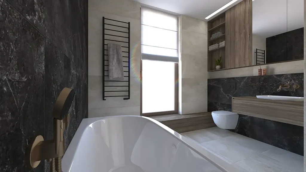 - Hliníková okna, dřevěné podlahy, designová sanita a obklady