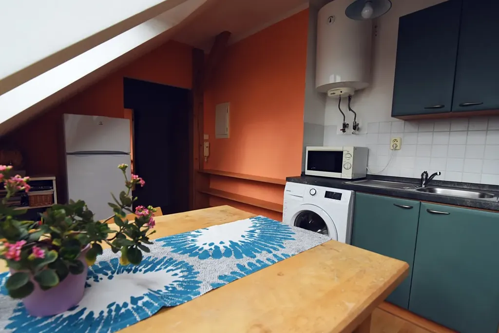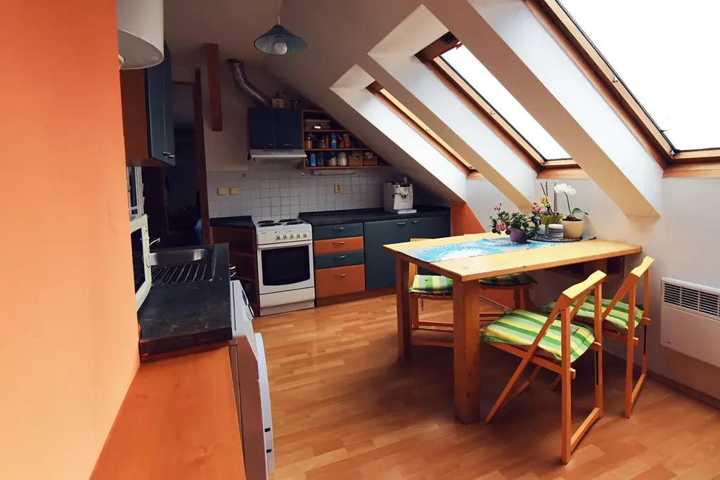 Velkou předností bytu je jeho kompletní vybavení nábytkem na míru, který efektivně využívá podkrovní prostor. Dispozice zahrnuje vstupní chodbu, kuchyni s jídelním stolem, koupelnu se sprchovým koutem a WC. Srdcem bytu je obývací pokoj, který je vybaven klimatizací, což oceníte zejména v letních dnech.