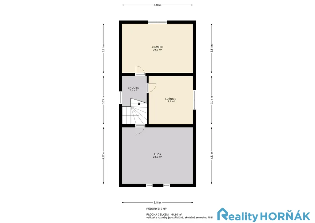 Podkroví domu tvoří půdní vestavba se dvěma pokoji a samostatným nevyužívaným půdním prostorem. Dispozičně zahrnuje dvě ložnice (5,48 m x 3,81 m = 20,9 m² a 3,40 m x 3,71 m = 12,7 m²), chodbu (2,00 m x 3,55 m = 7,1 m²) a půdu – nevyužívaný prostor (5,48 m x 4,37 m = 23,9 m²). Celková orientační plocha podkroví činí přibližně 64,6 m², z toho plocha pokojů a chodby přibližně 41 m² a samostatný půdní prostor 23,9 m². Případné další obytné využití půdy bude vyžadovat stavebně-technické posouzení. Součástí domu je sklepní prostor (25,2 m2) tvořený jednou místností.
