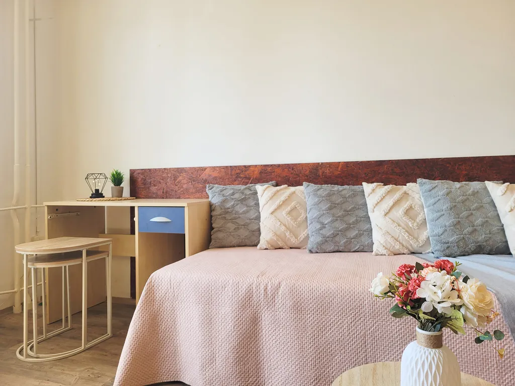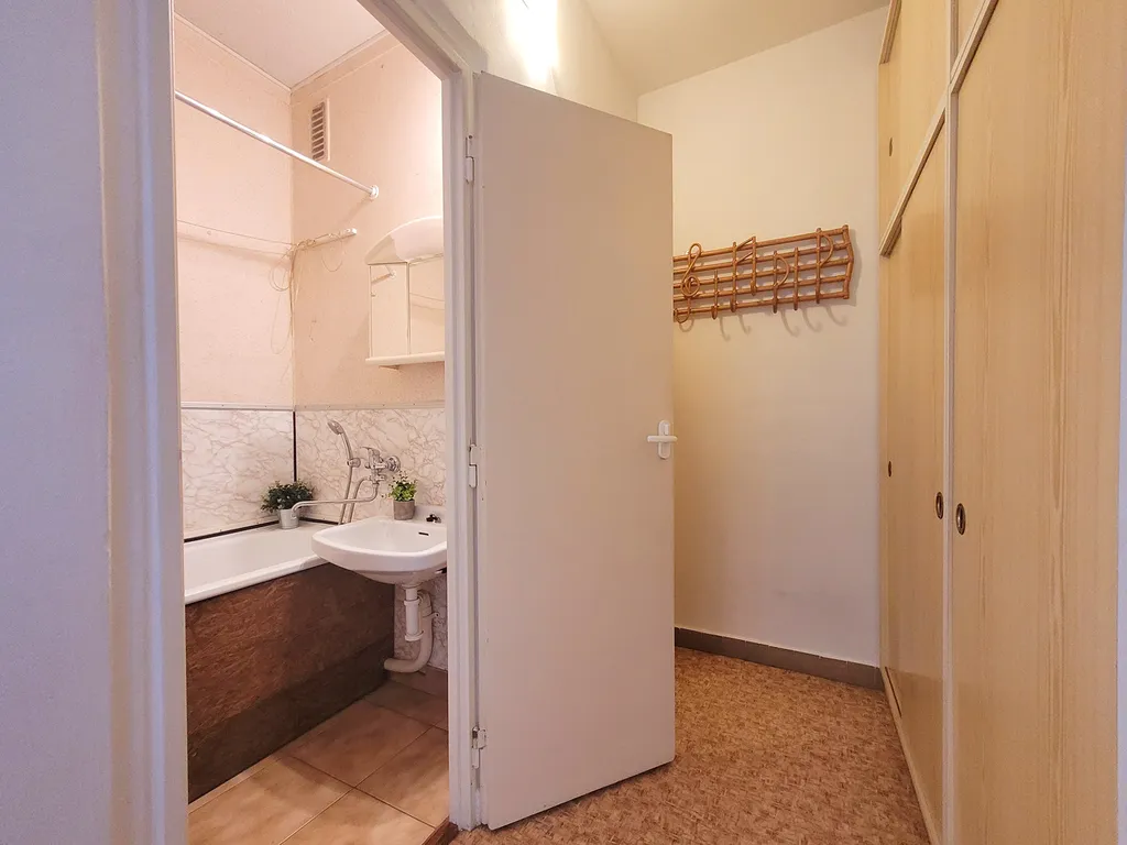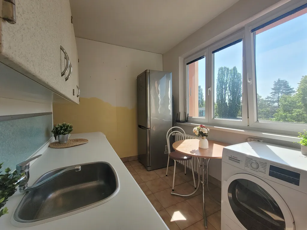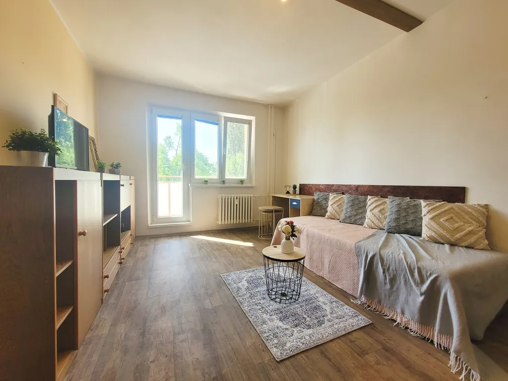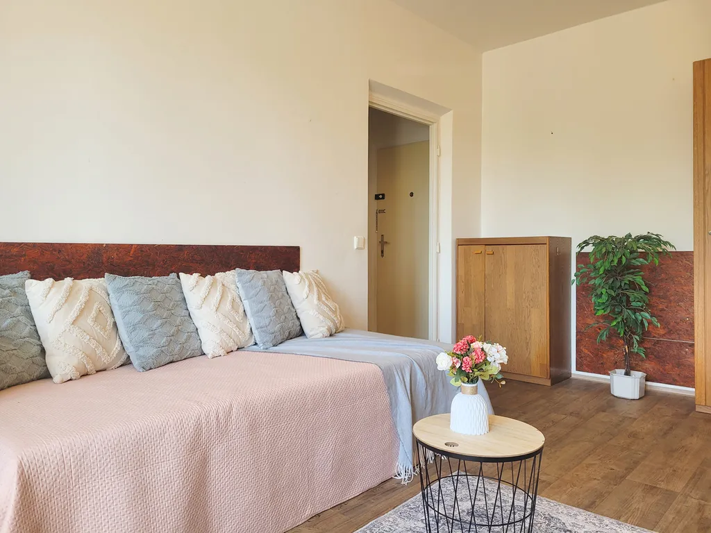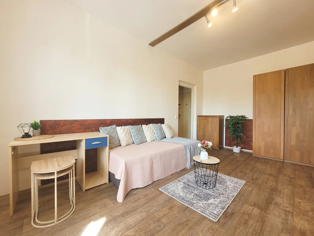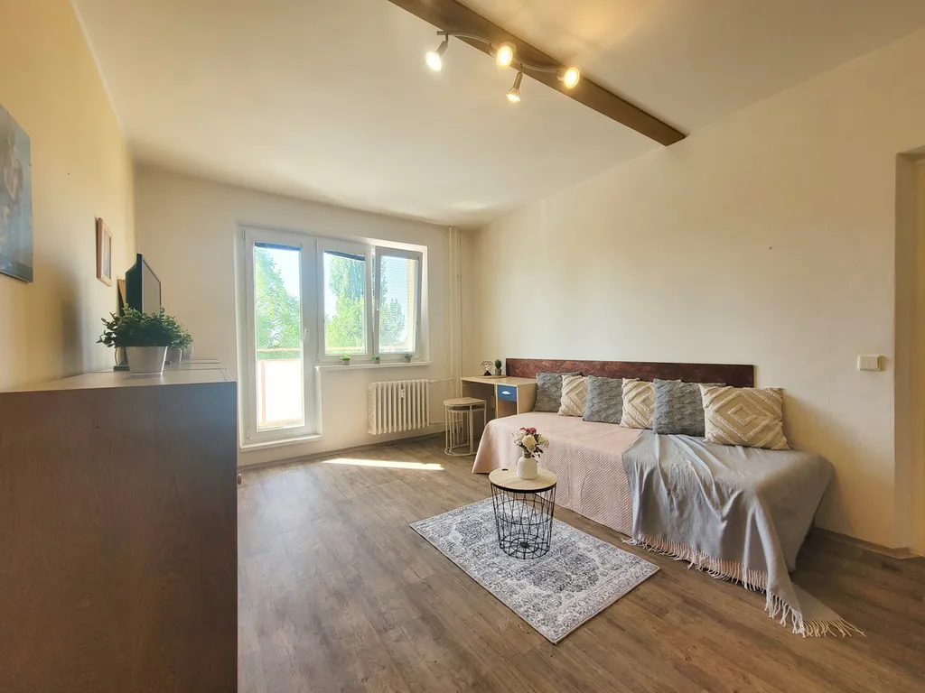 Dispozičně byt nabízí prostornou vstupní chodbu s dostatkem úložného prostoru, samostatnou kuchyň a světlý obytný pokoj. Z chodby je vstup do všech místností – žádné průchozí pokoje. Kuchyň je vybavená kombinovaným sporákem, lednicí, jídelním stolem a také pračkou a sušičkou. V obývacím pokoji najdete pohovku, komodu a další úložné skříně. Koupelna je vybavená vanou a toaleta je oddělená.