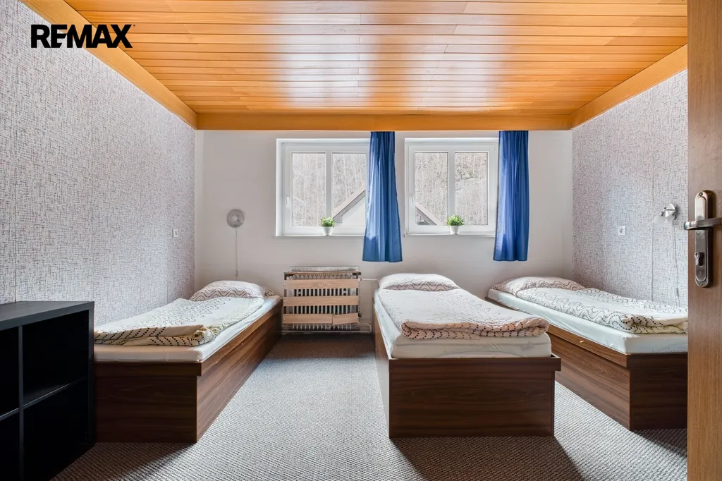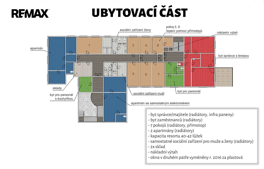 V patře je ubytovací část se 7 pokoji, 2 apartmány s vlastní koupelnou, byty pro personál a samostatný byt 2+1 pro majitele či správce.