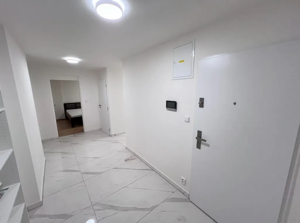 Interiér bytu zahrnuje prostornou chodbu, obývací pokoj, samostatnou kuchyň se spíži, kuchyň je vybavena spotřebiči (lednice, trouba s varnou deskou myčka), ložnici a koupelnu s vanou a WC.