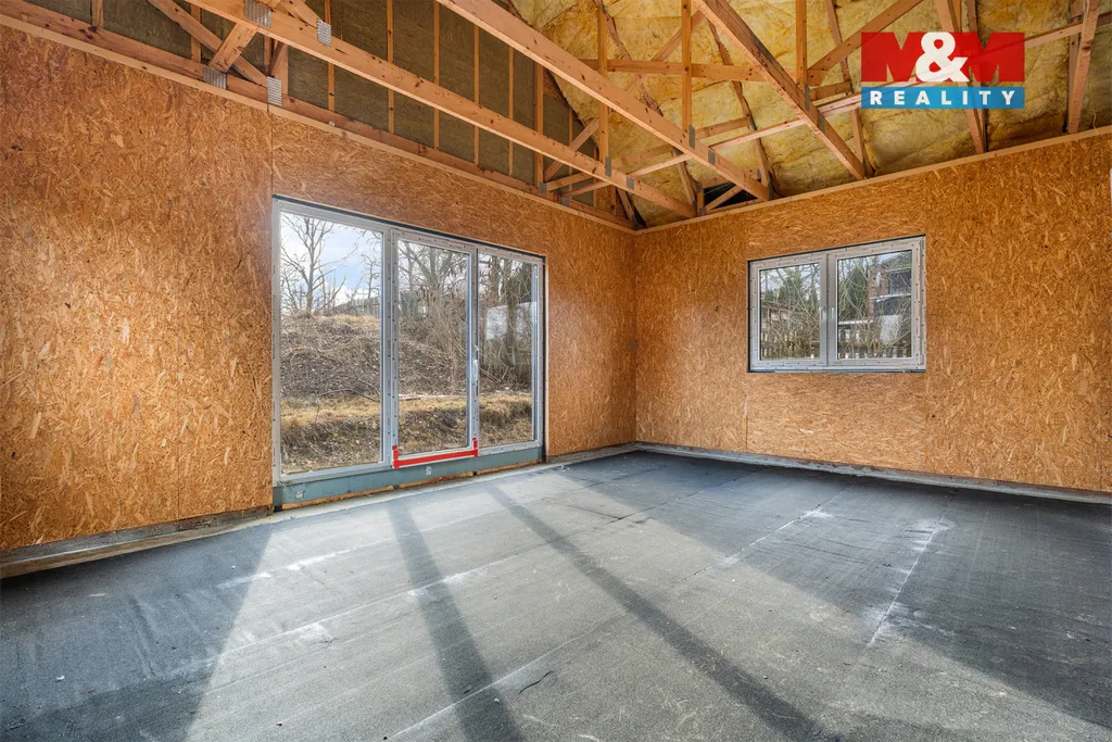 Z obývacího pokoje s kuchyňským koutem jsou připravené posuvné dveře na budoucí terasu, s výhledem na prostorný pozemek o velikosti 1 203 m², situovaný do velmi klidné části mimo hlavní silnici.