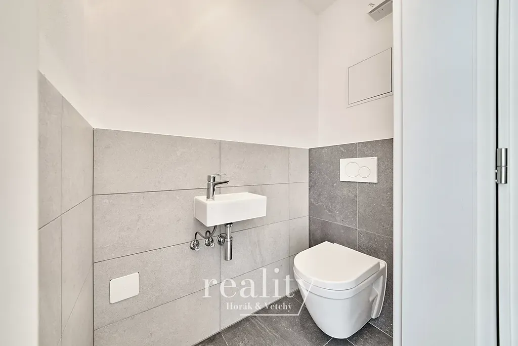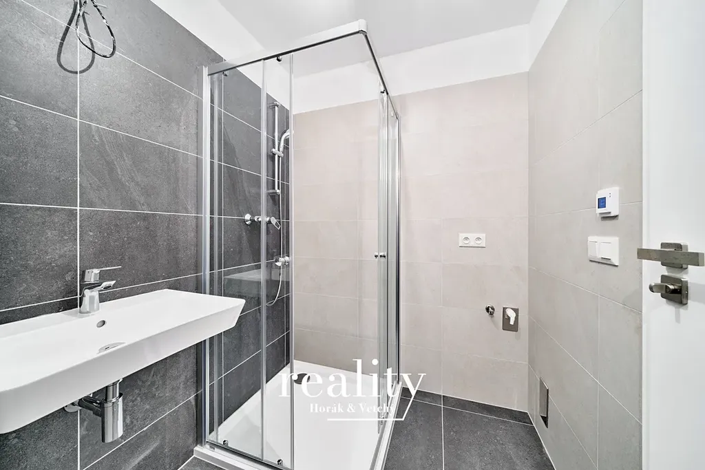 Fotografie jsou ilustrační ze stejného projektu, ale jiného bytu. V nabízeném bytě je v koupelně sprchový kout.