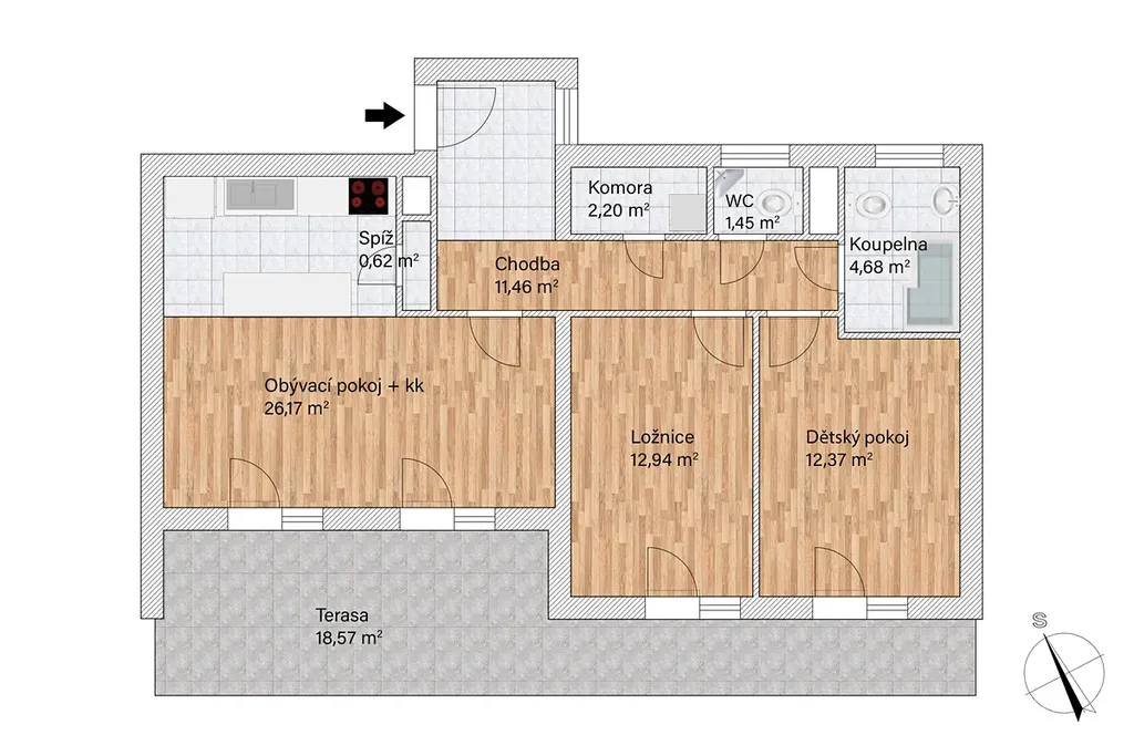 Nabízíme k prodeji pěkný a velmi dobře dispozičně řešený byt v OV, o dispozici 3+kk s terasou, o celkové výměře 101m2 vč. terasy a sklepní kóje (čistá obytná plocha bytové jednotky je 72m2), který se nachází v 5.n.p. domu, v klidné ulici U Hostavického potoka, v Praze 9. Byt je ve velmi dobrém stavu. Dispozice bytu - zádveří a chodba (11,5m2), obývací pokoj s kuchyňským koutem (26m2), ložnice (13m2), dětský pokoj (12m2), koupelna s vanou, umyvadlem a toaletou (5m2), samostatné WC s umyvadlem (1,5m2), komora bytu (2,2m2) a spíž v kuchyňském koutu (0,6m2). Z obývacího pokoje, ložnice i dětského pokoje je vstup na velkou terasu (27m2). Všechna okna obytných místností bytu, i terasa, jsou situována na jih - byt je tudíž velmi světlý a slunný. V kuchyňském koutu je instalována kuchyňská linka s ostrůvkem a s vestavěnými spotřebiči (horkovzdušná trouba, myčka nádobí, varná deska, digestoř). V předsíni, ložnici i dětském pokoji jsou vestavěné skříně, v komoře je vestavný regál a je zde umístěna pračka a sušička. Byt tedy nabízí hodně úložného prostoru. K bytu dále patří dvě garážová stání a sklepní kóje (1,5m2). V domě je výtah.