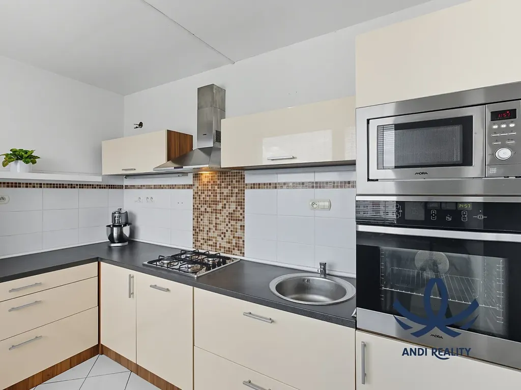 Kuchyň ve světlých tónech je plně vybavená spotřebiči jako je myčka, lednice, trouba, plynový sporák s digestoří a také mikrovlnná trouba.