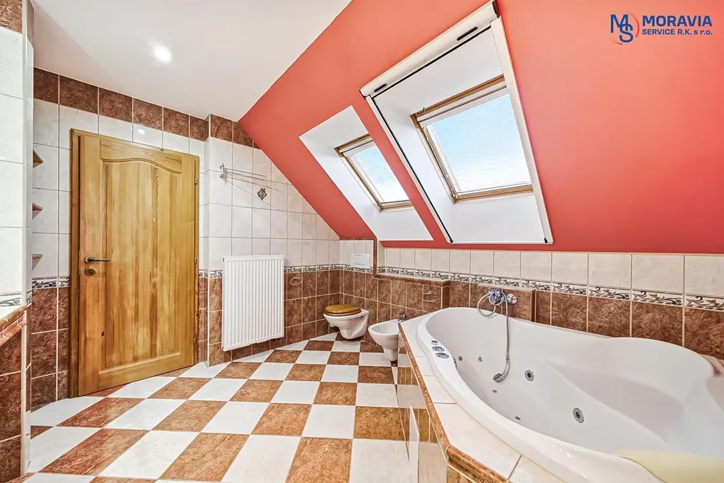 velká koupelna s hydromasážní vanou, 2 umyvadly, bidetem a toaletou