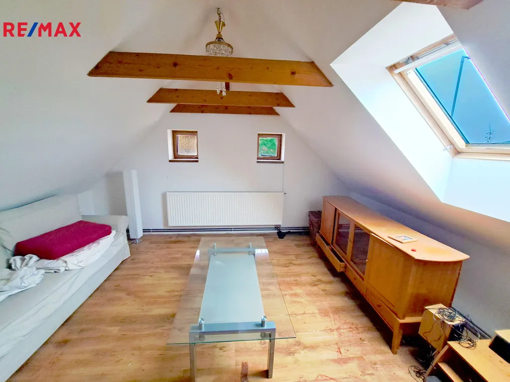 2. nadzemní podlaží (podkroví): velká obytná místnost opticky rozdělená na dvě části