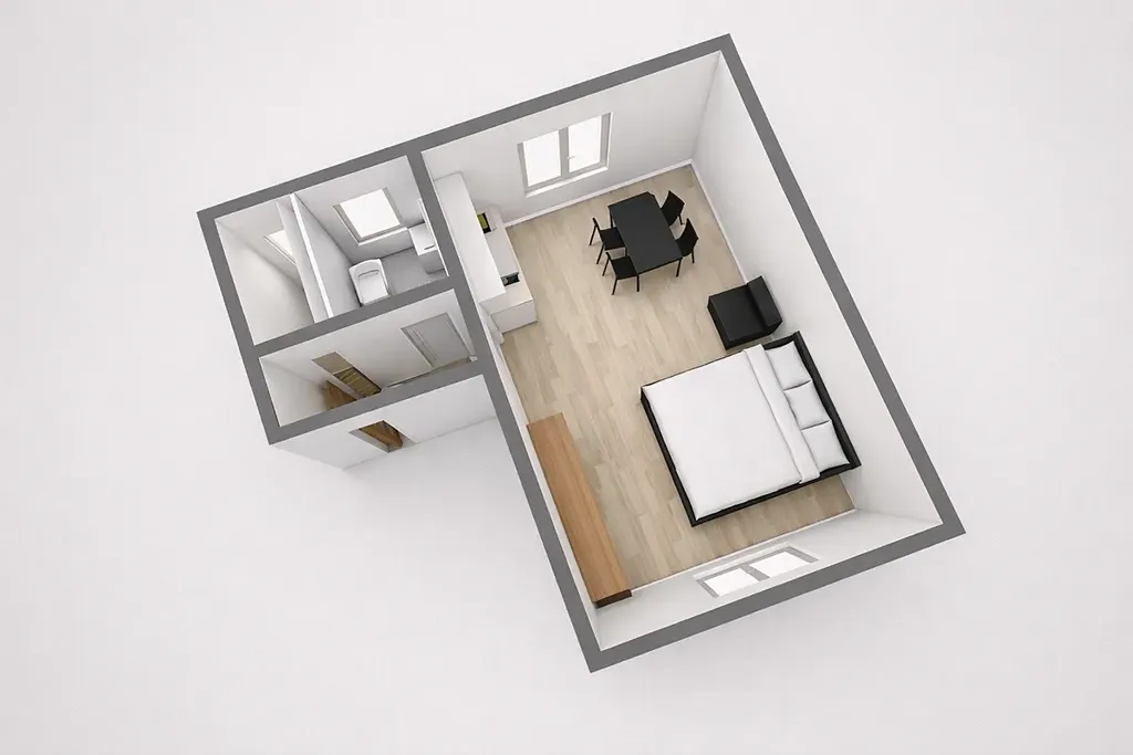 prostorný obytný prostor s kuchyňským koutem, který nabízí místo pro vaření, relaxaci i odpočinek