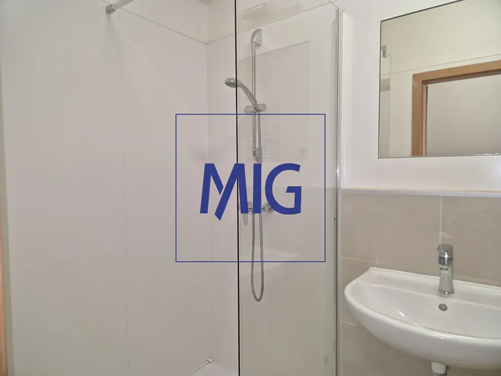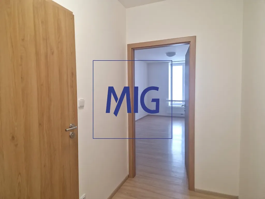 Obývací pokoj o ploše 19 m2 je vybaven kuchyňským koutem, dále je tu dost prostoru pro jídelní stůl se židlemi, postel a skříňky. Do zádveří se pohodlně vejde šatní skříň i botník, koupelna je vybavena umyvadlem, toaletou, sprchovým koutem a přípojkou pro pračku. Byt se pronajímá bez vybavení.