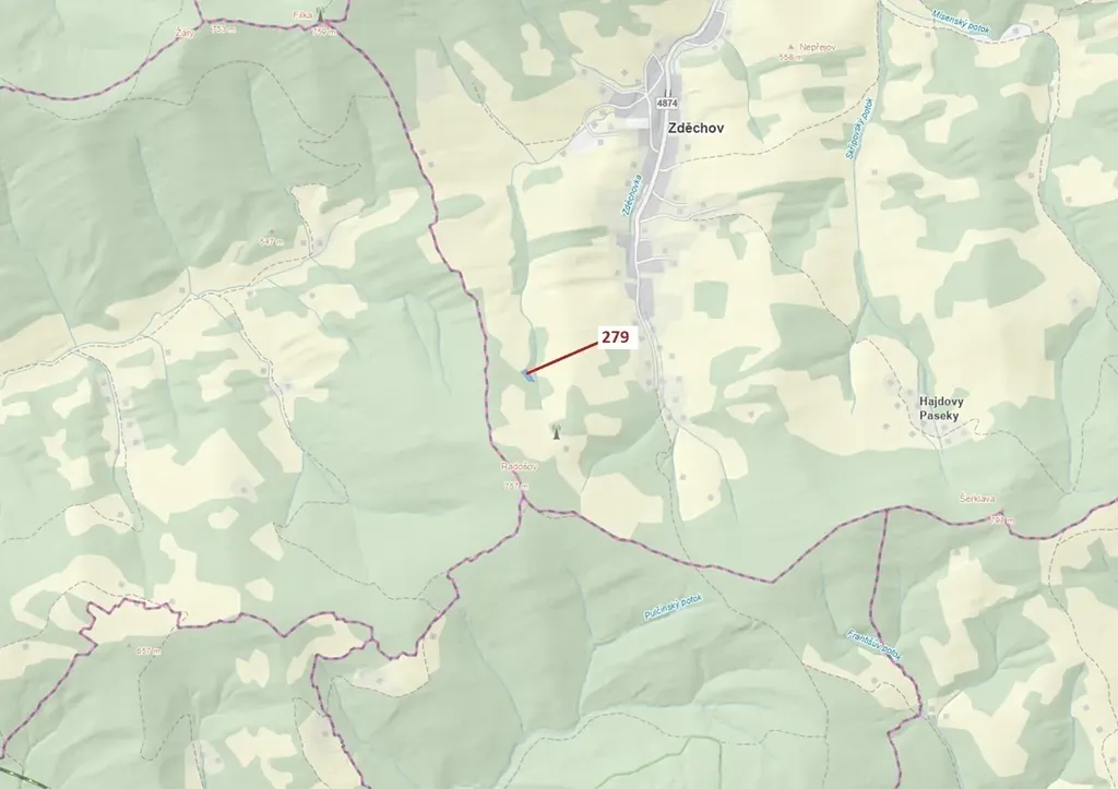 Lesní pozemek o výměře 1413 m2, parcelní číslo 279, podíl 1/1, katastrální území Zděchov, obec Zděchov, obec s rozšířenou působností Vsetín, okres Vsetín, Zlínský kraj.