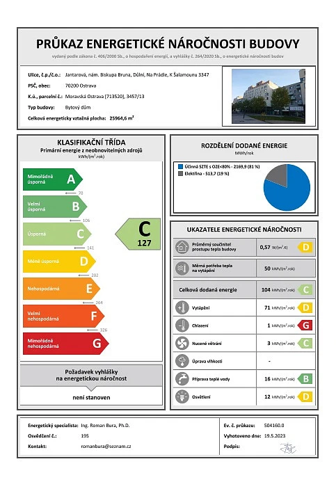| Ukazatel energetické náročnosti | 127 kWh/m2 za rok |