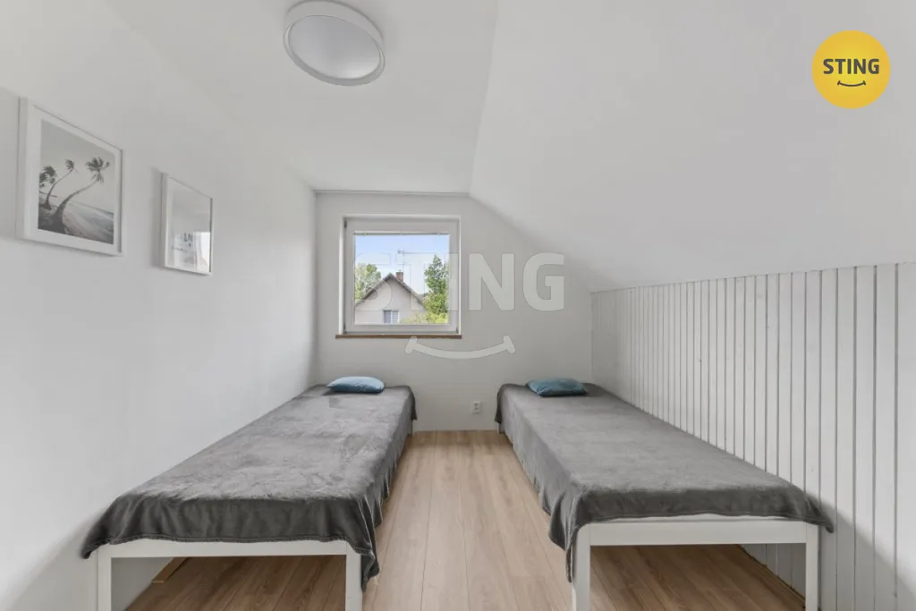 V patře jsou dvě samostatné ložnice orientované do klidného dvora a prostorná chodba se vstupem na slunný balkón o velikosti 14 m² – ideální místo pro ranní kávu nebo večerní odpočinek. Vytápění je zde řešeno elektrickými přímotopy.