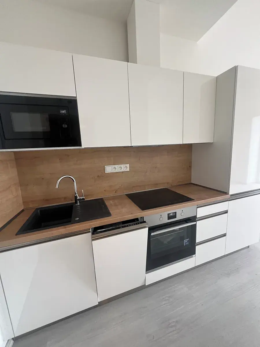 Obývací prostor s kuchyňským koutem: vestavěná kuchyňská linka na míru s indukční varnou deskou, elektrickou troubou, myčkou, ledničkou s mrazákem, digestoří, dřezem s baterií.
