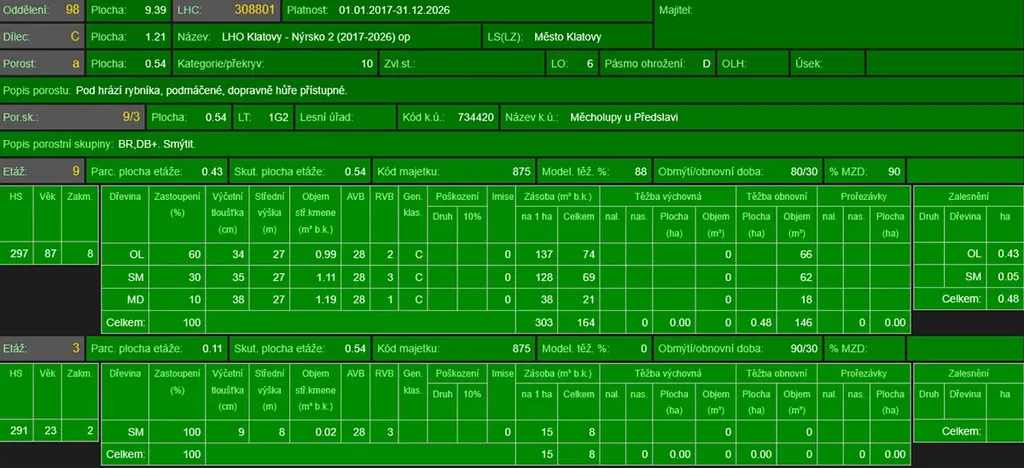 - p.č. 241/2 vedená jako lesní pozemek o celkové výměře 5 432 m2 (stáří lesa 96 let - zastoupení dřevin olše, smrk, modřín, stáří lesa 32 let - zastoupení dřevin smrk),