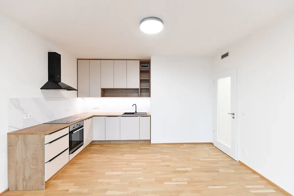 obývací pokoj s novou kuchyňskou linkou a novými spotřebiči (myčka, indukční varná deska, trouba; lednice není součástí) se vstupem na terasu/lodžii