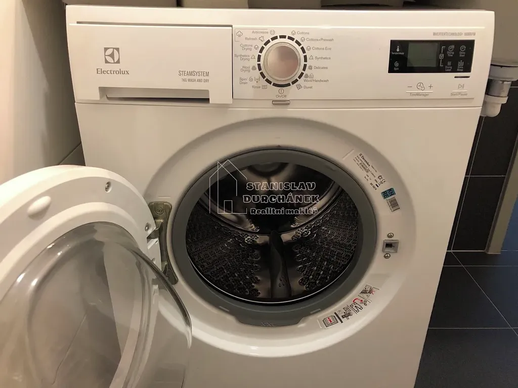 Společné části bytu jsou koupelna s vanou, 2 umyvadly, pračkou se sušičkou a dále samostatné WC s umyvadlem a vstupní chodba se skříní.