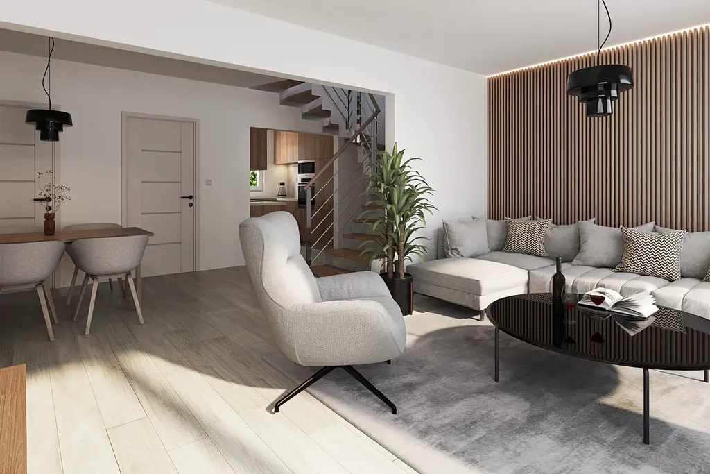 Rodinný dům K 90 je navržen jako jednopodlažní objekt s obytným podkrovím zastřešený sedlovou střechou. V rámci projektu Újezd u Brna je koncipován jako řadový dům nebo jako dvojdům. Součástí domu je garáž, která je od domu provozně oddělena. Jedná se o nejmenší dům z naší nabídky, dispozičně spadá do kategorie 4+kk. Dům je navržen velmi efektivně s minimalizací komunikačních ploch. Hlavní vstup do objektu je z ulice do vstupní haly , ze které je přístupné technické zázemí a WC. Zbývající část 1.NP zaujímá hlavní obytný prostor s jídelnou a kuchyňským koutem. Z tohoto prostoru je po lehkém ocelovém schodišti přístupné 2.NP. Ve 2.NP jsou umístěny tři pokoje a koupelna.