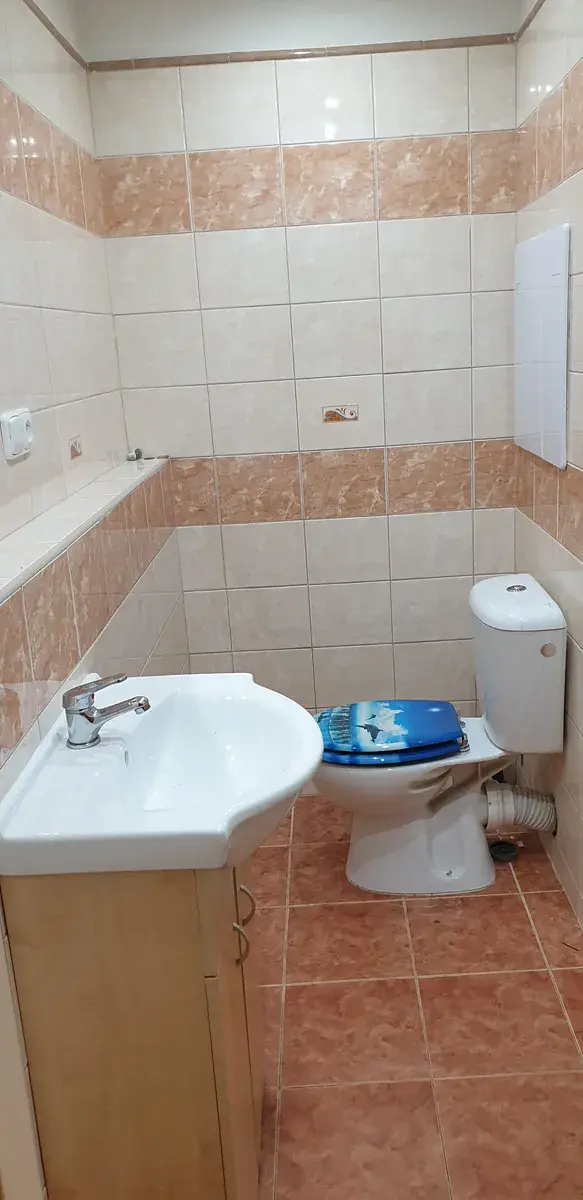 Koupelna je zděná, prostorná, s menší vanou, přípojka na pračku je v předsíni, kde jsou další úložné prostory ve velké skříni.