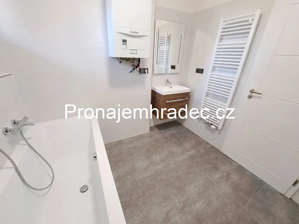 V koupelně se nachází vana s termostatickou baterií a závěsné WC. Byt je vytápěn úsporným kondenzačním kotlem, který zároveň zajišťuje ohřev teplé vody.