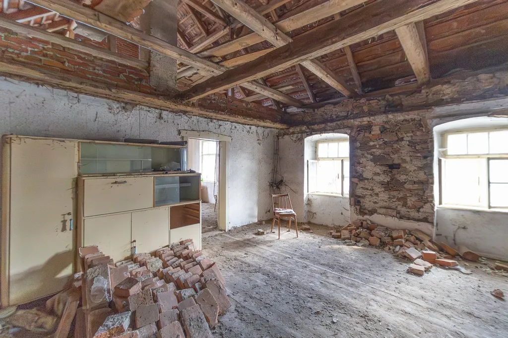 Dominantou uzavřeného dvora, který poskytuje naprosté soukromí, je velká, částečně otevřená stodola o zastavěné ploše 158 m². Tato unikátní stavba stojí na masivních zděných cihlových sloupech, které jí dodávají netradiční vzhled. Její horní dřevěná část historicky sloužila jako sklad sena a dnes nabízí obrovský prostor pro kreativní využití, od zahradního ateliéru až po velkorysé společenské zázemí. Obrovskou výhodou je přítomnost kvalitního stavebního materiálu přímo na pozemku – původní kámen a dřevěné trámy jsou připraveny k dalšímu využití, což stavbě dodá autenticitu a novému majiteli ušetří náklady.