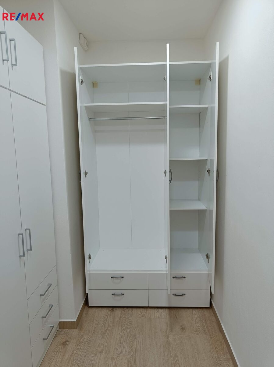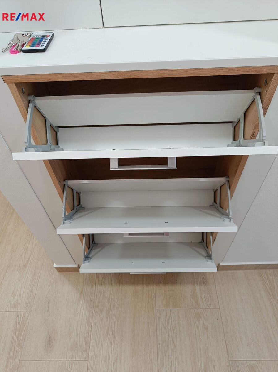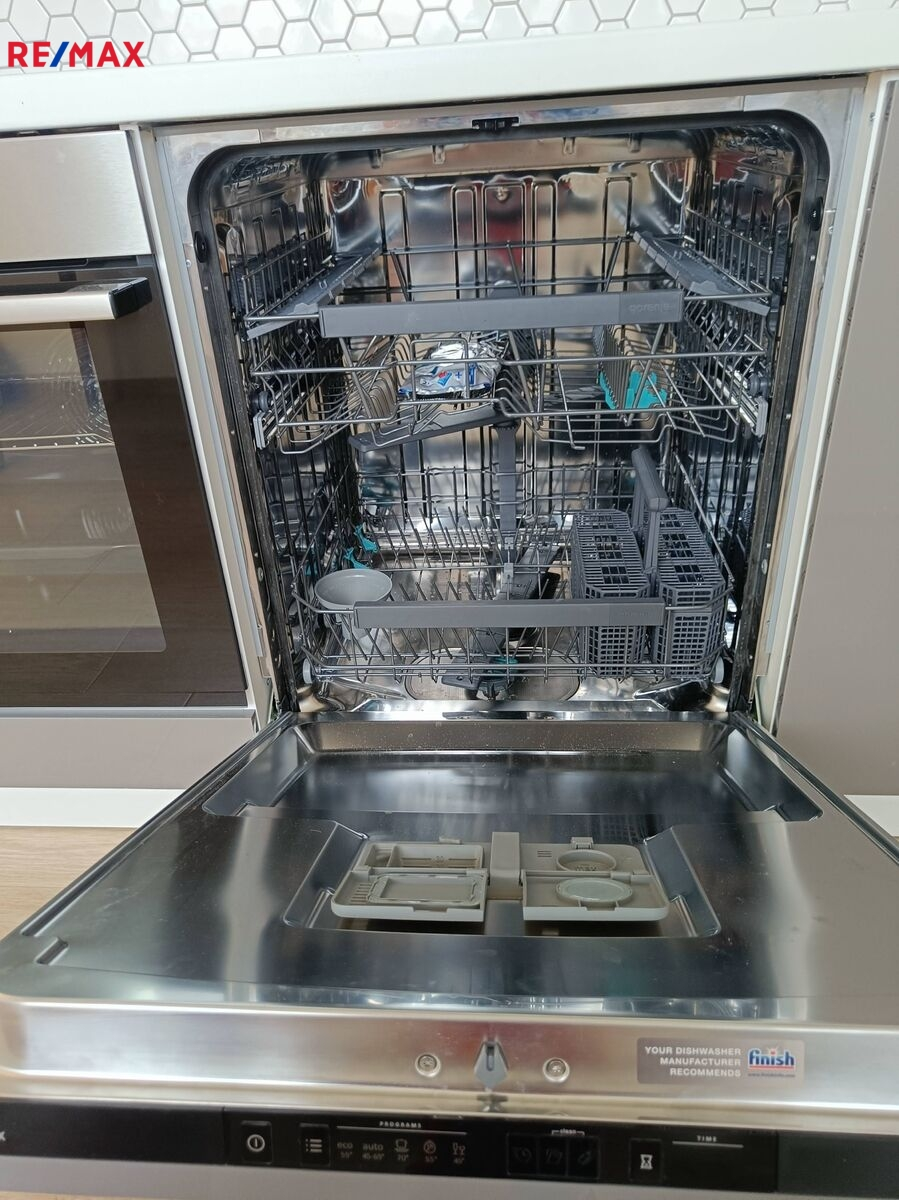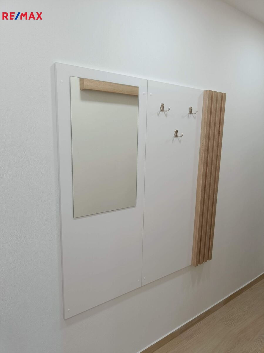 Dispozice bytu zahrnuje dva samostatné pokoje, kuchyni se spotřebiči - myčkou, lednicí s mrazákem, elektrickou troubou, varnou sklokeramickou deskou, koupelnu se sprchovým koutem a WC. Po domluvě je i možnost odkoupení vybavení, nábytku, sušičky a pračky za přijatelnou cenu, jinak se byt nabízí bez vybavení.