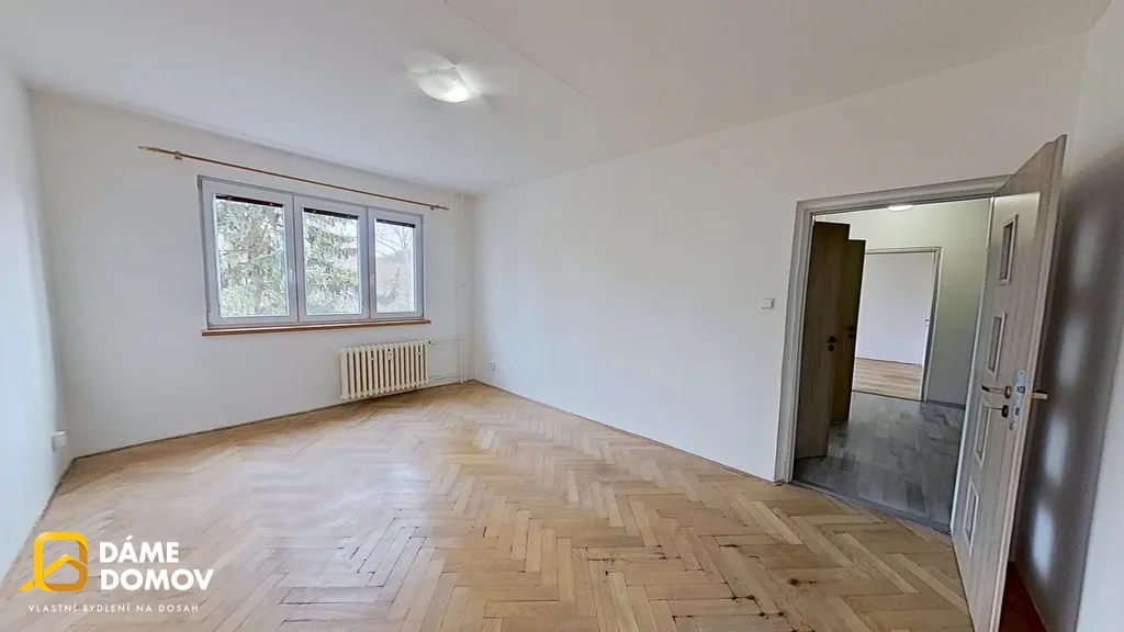 Po vstupu do bytu se nacházíme v chodbě (do konce února bude instalována nová vestavná skříň), ze které máme přístup do všech místností. První se nabízí otevřená kuchyně (do konce února bude vyměněna pracovní deska kuchyňské linky), pak samostatné WC a koupelna s přípojkou na pračku a nad ní prostorem na sušičku. Posledními místnostmi jsou dva pokoje vlevo a vpravo od dveří.