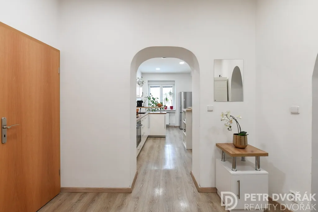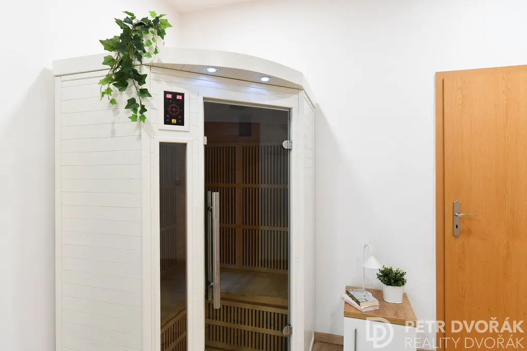 Vstupní předsíň s novou plovoucí podlahou nabízí dostatek úložného prostoru a praktickou komoru / šatnu. Součástí předsíně je i neobvyklý bonus – vlastní infrasauna pro regeneraci v soukromí domova. Samostatná kuchyň disponuje moderním vybavením a pohodlným prostorem jak pro vaření, tak pro každodenní stolování. Obývací pokoj zaujme množstvím přirozeného světla a renovovanými parketami, které dodávají interiéru teplý a nadčasový charakter. Ložnice se dvěma okny poskytuje klidné zázemí s výhledem do dálky. Třívrstvá komorová okna v celém bytě zajišťují vynikající tepelnou i hlukovou izolaci. Koupelna s vanou a pračkou je obložena novou dlažbou a obklady, toaleta je řešena samostatně.
