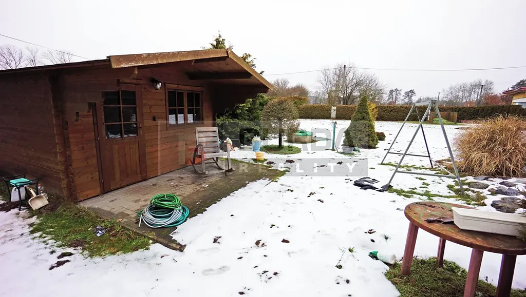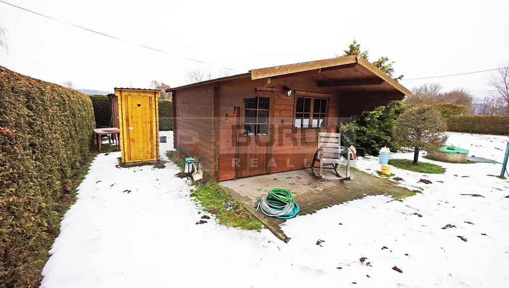 Dále je na pozemku dřevěná chata na nářadí, s podlahou z betonových dlaždic, zastřešená trapézovým plechem.