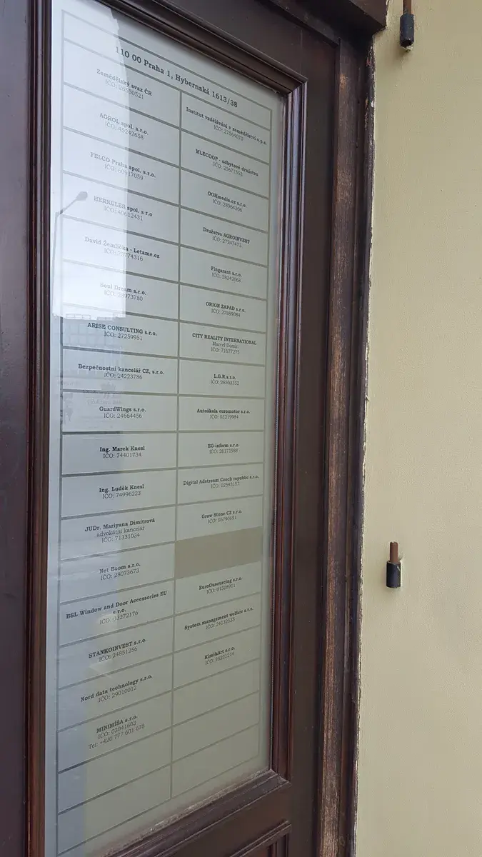 Ve vstupní hale budovy je k užívání vlastní poštovní schránka, zvonek atd.....Grafickou podobu umístění informační tabule o rozměrech 81,5 x 5,8 cm na lištách umístěné ve foyer domu Hybernská - najdete na jedné z vložených fotografií.
