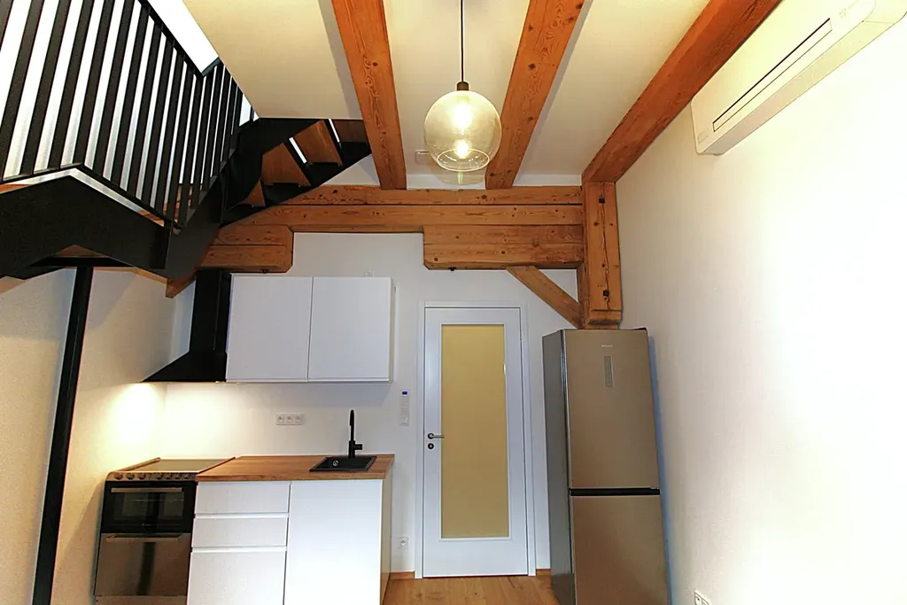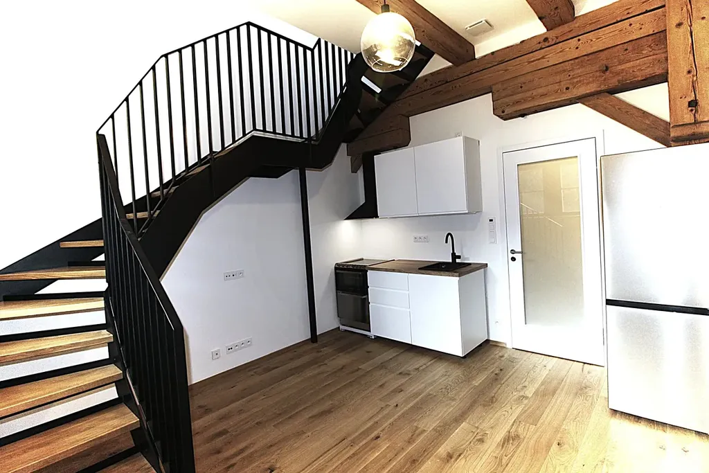 Praha 4, Nusle, nabízíme Vám výjimečné bydlení v oceněném projektu Nuselský pivovar. Rezidence je přístupná přes novou lávku a obchodní pasáž. Loftový byt, kde jsou zachovány původní dřevěné trámy, je dispozičně řešen jako 2+kk, 43 m2, v ceně je garážové stání a prostorná, bezpečná sklepní kóje. Tento krásný byt se nachází v uzavřeném areálu, který je přístupný pouze pro rezidenty. Obývací pokoj je propojen s kuch. koutem (s el. troubou, varnou deskou, malou myčkou nádobí), k vybavení patří lednička s mrazákem. Dominantu tvoří pohodlné schodiště, kterým se vchází do druhého podlaží bytu, kde je umístěna ložnice, prostor pro šatní skříň a velká koupelna se sprchovým koutem a WC. V 1. podlaží bytu při vstupu do bytu se nachází také WC s bidetovou sprchou, je zde prostor a přípojka na pračku, sušičku. Vytápění je centrální, v bytě je klimatizace. Tento byt se právě připravuje pro prvního nájemníka. Díky své poloze jsou všechny služby na dosah ruky, včetně výborné dopravní dostupnosti. K dispozici od 1.3. 2026.