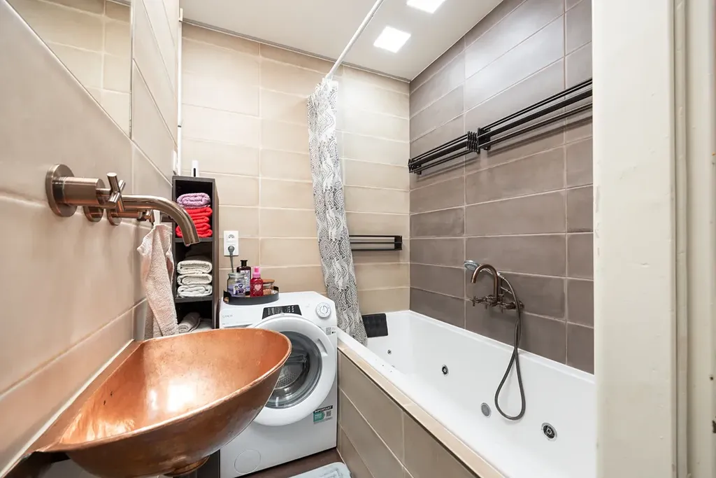 Z chodby se dostanete do koupelny s velkou masážní vanou, která vybízí k relaxaci po těžkém dnu. Je zde možnost připojení pračky a sušičky. Nechybí samostatné WC