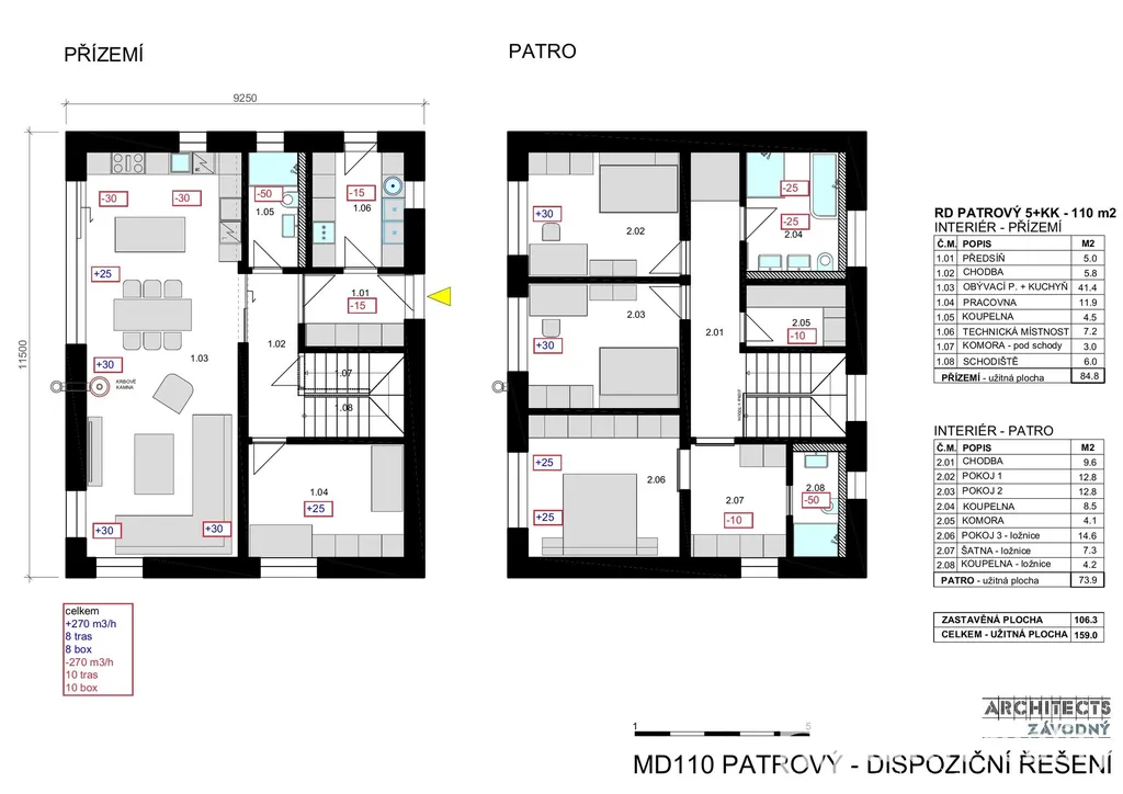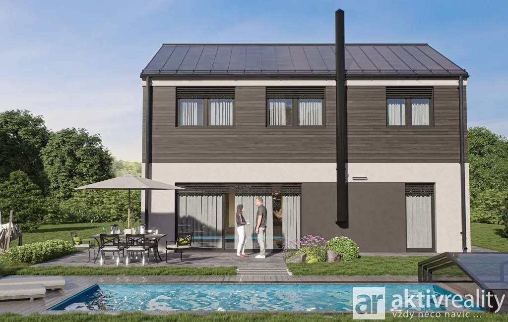 Technické parametry: dispozice 5+kk, užitná plocha 159 m², zastavěná plocha 106,3 m², přízemí 84,8 m², patro 73,9 m², šikmá střecha, možnost krbových kamen dle projektové dokumentace, samostatná technická místnost. Standard zahrnuje tepelné čerpadlo Vaillant a podlahové vytápění ve všech obytných místnostech.