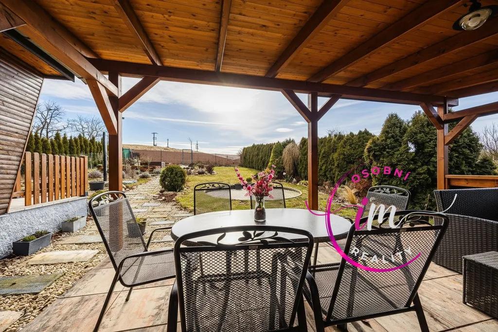 Tato kouzelná chata se může pochlubit i elegantní pergolou, která je ideálním místem pro romantické večeře při západu slunce nebo tiché chvíle s knihou v ruce.