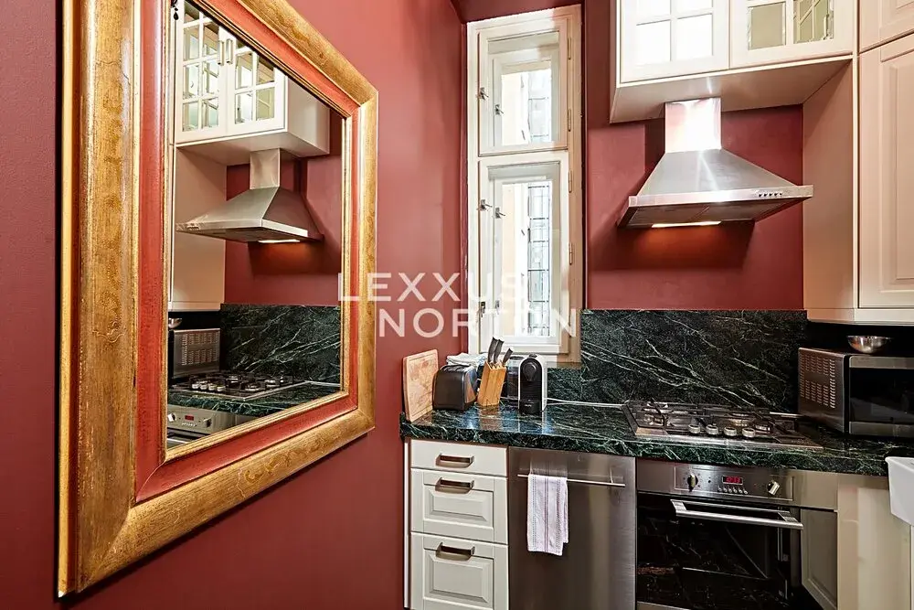 Součástí zařízeného bytu je plně vybavený kuchyňský kout (trouba, lednice, mrazák, myčka nádobí, sklokeramická deska, digestoř), koupelna s vanou a toaletou. K dispozici je také pračka i sušička, internet, kabelová TV, prestižní nábytek i orientální prvky. Podlahovou krytinu tvoří kvalitní parkety a mramorová dlažba.