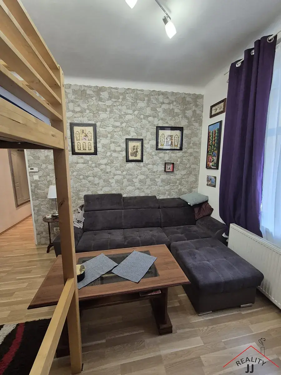 Vstupujeme chodby do druhé – největší místnosti bytu- do obývacího pokoje, který zároveň slouží jako jídelna, ložnice i pracovna. Obývací pokoj je kompletně zařízen novým nábytkem. Je zde praktická patrová postel s prostorem pro pracovní kout s psacím stolem.