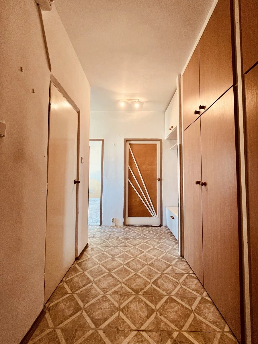 Nabízí se částečně vybavený. Z dlouhé chodby s úložnými prostory vcházíme do koupelny na toaletu, do kuchyně a také do dvou neprůchozích pokojů.