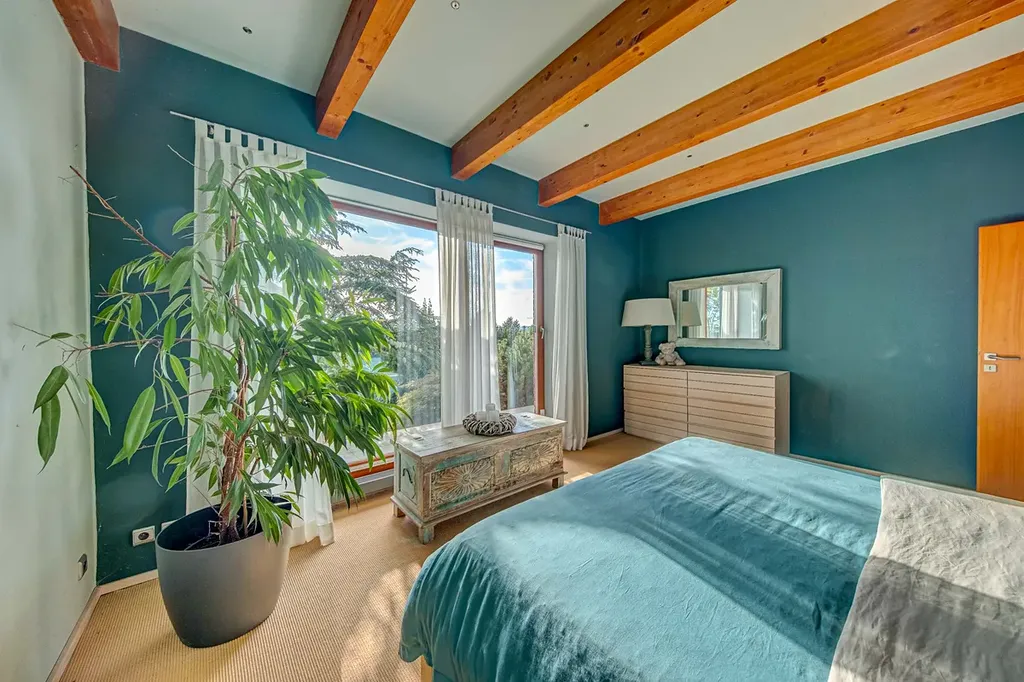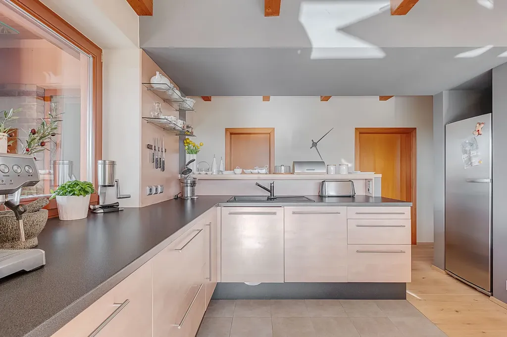 Srdcem domu je veliký obývací pokoj spojený s jídelním a kuchyňským koutem. Dostatek světla zajišťují velkoformátová okna směřující na jihozápad, poskytují uklidňující pohled do překrásné zahrady i ničím nerušený výhled v úhlu 180 ° na brdské lesy. Pocit prostoru a vzdušnosti dodávají také některé prosklené dveře. Součástí obývacího pokoje je velké akvárium. I když jste uvnitř domu, cítíte se spojeni se zahradou a okolní, krásnou přírodou.