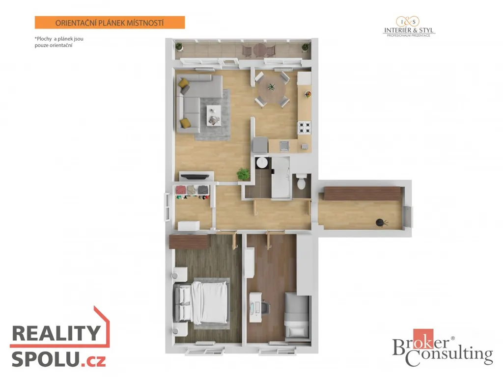 Ložnice i druhý pokoj jsou neprůchozí, což ocení rodina i ti, kdo potřebují pracovnu nebo dětský pokoj. Samostatné WC je oddělené od koupelny. Velkou výhodou tohoto bytu je jeho orientace na tři světové strany, díky čemuž je byt po celý den příjemně prosvětlený a působí velmi vzdušně.
