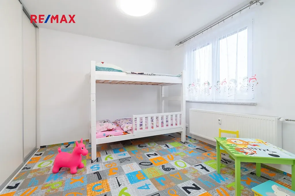 Dispozice bytu je velmi praktická a přehledná – vstupní chodba, koupelna, samostatné WC, kuchyně s jídelnou, dětský pokoj, obývací pokoj a ložnice s přímým vstupem na lodžii, která je navíc vybavena posuvnou skleněnou stěnou a lodžie tak nabízí příjemné místo pro ranní kávu nebo večerní klid v jakémkoli počasí. Velkou výhodou jsou také tři prostorné vestavěné skříně, které poskytují dostatek úložného prostoru bez nutnosti dalších kusů nábytku. K bytu náleží dva sklepy, vlastní kousek společné zahrádky a plechová garáž (15 m²), což je kombinace, která se u bytů objevuje jen zřídka a výrazně zvyšuje komfort bydlení.